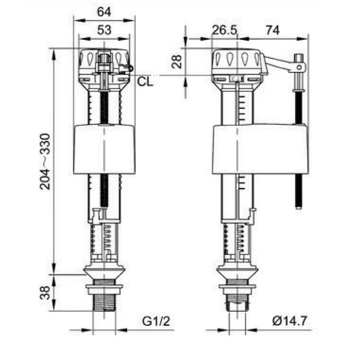 Standard configuration: Connector of G1/2 Product height adjustable range: 204 - 330mm The height can be adjusted to fit that of toilet tank: the highest after being heightened is 380 and the lowest 204 Optional configuration: Plastic connector of 15/16" and brass connector of G3/8 Flow Regulator: For high water pressure areas Plug adapter: Refill range: 0.31%, For toilets that need refill water The height can be adjusted to fit that of toilet tank: the highest after being heightened is 380 and the lowest 204 Barrel-style Dual Flush Valve Standard configuration: Fixed overflow Adjustable partial flush range: 0 -155mm Adjustable full flush range: 0 - 30mm For tiolets with tank height of 240 - 370mm For full flush, about 10mm change in water level for adjustment level; for partial flush, about 3mm change in water level for adjustment level Optional configuration: Adjustable overflow tube Two-piece toilets: available with a wide variety of spud nuts One-piece toilets: metal lock Various push- buttons for selection For full flush, about 10mm change in water level for adjustment level; for partial flush, about 3mm change in water level for adjustment level |
